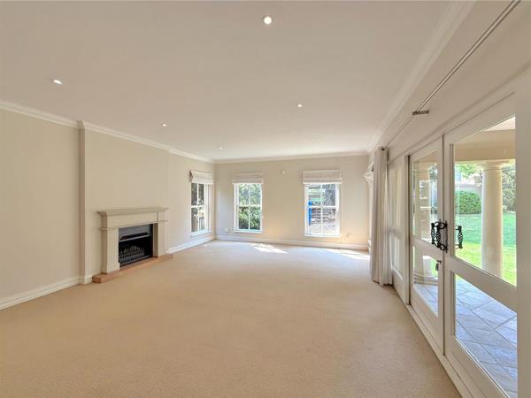 The formal lounge, complete with a cozy fireplace, opens onto the covered patio and child-friendly garden, where a gated pool and jungle gym make it ideal for families.