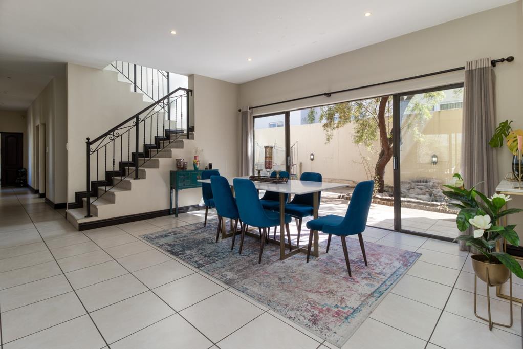 Nestled within the prestigious Dainfern Golf Estate, this beautifully positioned contemporary home offers sweeping panoramic views and elegant living spaces. A double-volume entrance leads into a spacious open-plan layout featuring a dining area, TV lounge, and a sleek granite-topped kitchen with a pantry and scullery. A formal lounge adds refinement, while the lower level includes a private en suite guest bedroom. Upstairs, three additional bedroomstwo en suitewith access onto a balcony that captures the serene surroundings.
