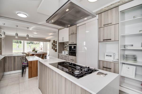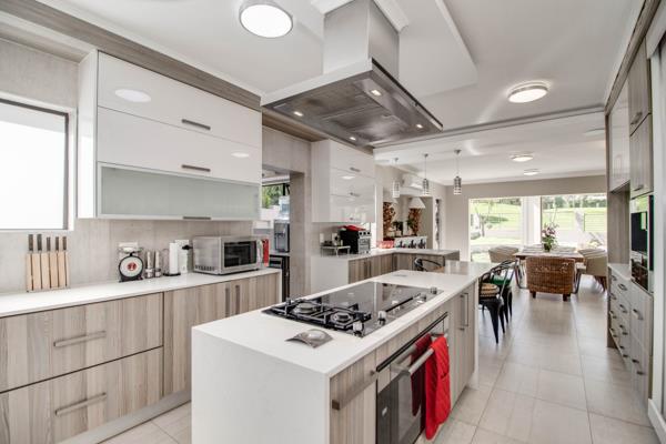 From the moment you approach, a beautifully carved Moroccan-style double door signals the bespoke design awaiting inside. Inside, a grand staircase makes a bold statement, framing views of the landscaped garden and the rolling fairway beyond. The outdoor spaces are thoughtfully designed for al fresco living, with a fire pit and gas braai nestled to enjoy the serene golf-course panorama. Large frameless glass doors create a seamless flow to the garden and the inviting pool, inviting the outdoors in and enhancing the sense of space. With high ceilings and carefully chosen lighting, the home feels bright and serene, while a discreet built-in bar adds a touch of contemporary elegance to the formal entertaining area. The kitchen is an open-plan showpiece drenched in natural light, featuring a built-in coffee machine, a cozy eat-in nook, and a separate scullery for practical living and easy entertaining.