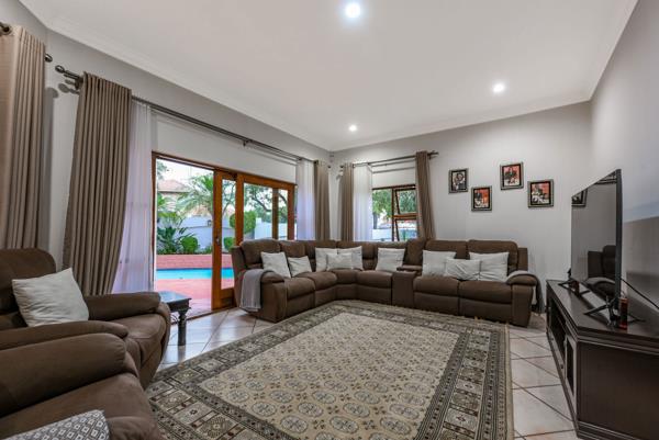 The open-plan living area extends out to a covered patio, overlooking a sparkling swimming pool and a lush, manicured garden perfect for family gatherings and outdoor entertainment.