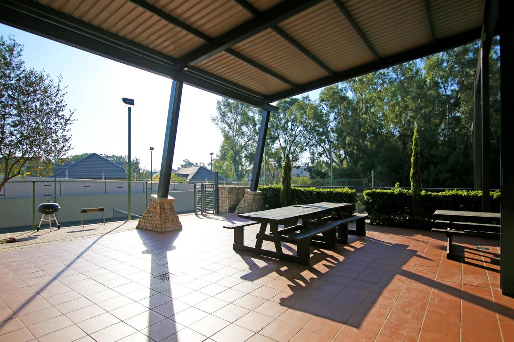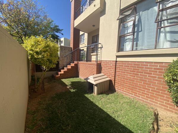 The patio is covered and has stairs leading down to the small and neat private garden.