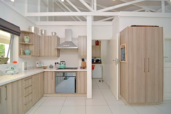 Modern kitchen with gas hob, water filter and a separate scullery with space for 3 appliances.
