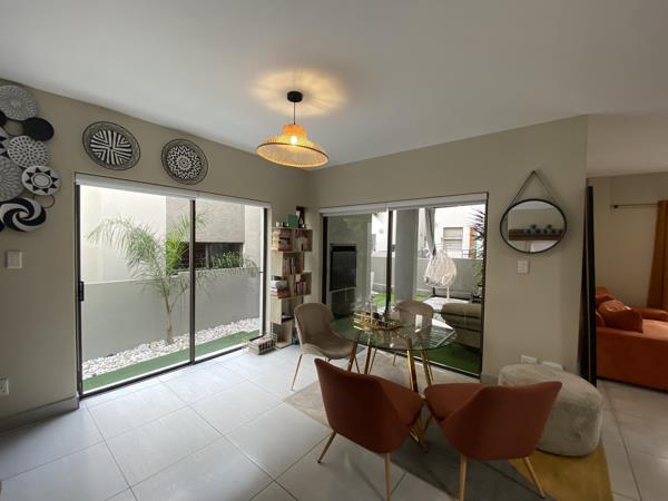 This exquisite double-storey residence offers three elegant bedrooms upstairs, including a luxurious main suite with a flowing open-plan bathroom and stylish walk-in closet, creating a serene and private retreat. A full shared bathroom in the passage complements the two additional bedrooms, all beautifully designed for modern living.