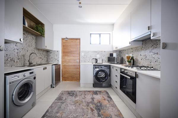 The open-plan kitchen and living area extend onto a private balcony ideal for relaxed mornings or evening sunsets. The kitchen is neat and practical, featuring a pantry, linen, and broom cupboard, with space for three appliances. A standard gas hob is fitted, and the unit is fibre-ready for your convenience.