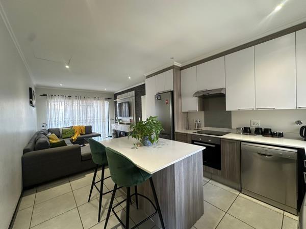 The kitchen offers a built-in centre island with ample storage and eco-friendly appliances, including a washing machine, dishwasher, fridge, electric hob, oven, and extractor fan. It flows into a stylish living room with a plush U-shaped couch, wall unit, and flat-screen smart TV, leading to a covered balcony with stunning views of Johannesburg''s sunsets.