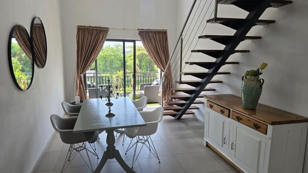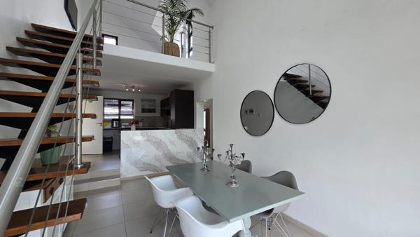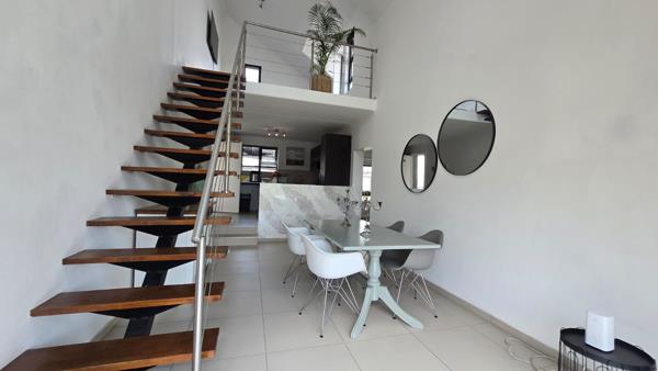 Up the stairs, you will find the loft area, elegantly set up as a TV room or lounge, perfect for relaxation or entertainment. From here, step out onto a large terrace with stylish outdoor furniture a perfect space for hosting friends or enjoying the beautiful Fourways views.