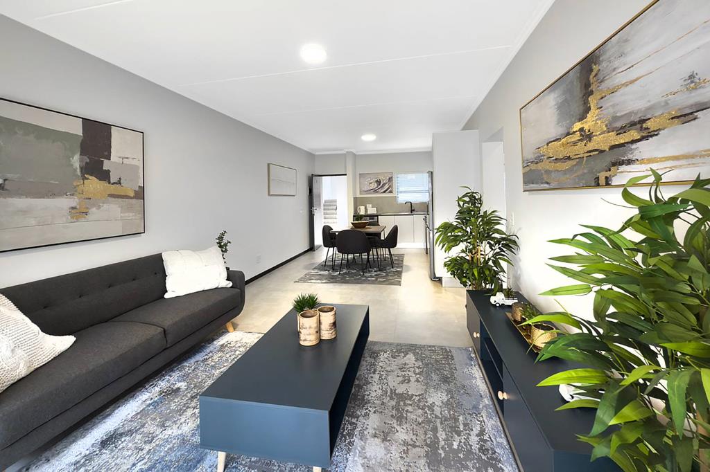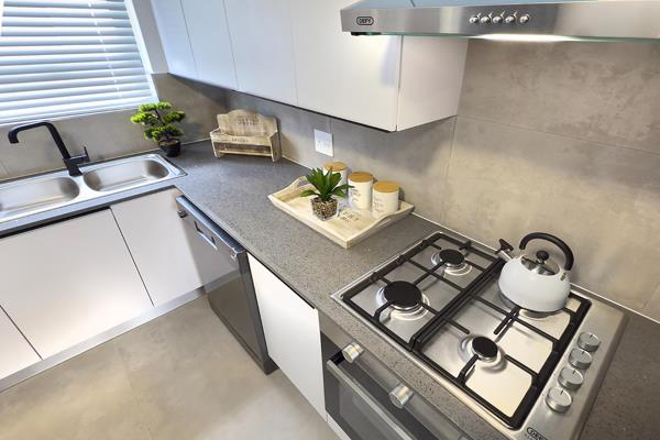 The kitchen is modern with a gas stove, plenty of cupboard space, and caesar stone tops. Top-quality fitted Defy appliances, with energy-efficient heat pumps and LED lights so your energy consumption is very economical.