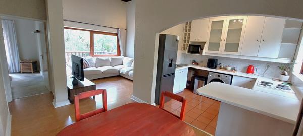 Large windows provide natural light and the open-plan living area includes ample space for separate lounge and dining settings. Lounge sliders open out to a large balcony with built-in braai and lovely tree top view. Well-appointed kitchen includes ample cupboard space, a breakfast bar, electric cooking, space for 2 under-counter appliances plus single door fridge. The apartment has two separate bedroom suites. Main with full en-suite bathroom and passage to family bathroom with bath and 2nd bedroom. Fibre ready. Unfortunately not pet friendly.