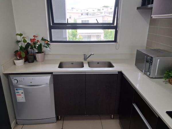The modern feature kitchen has ample cupboard space and the fridge, washing machine, dishwasher and tumble drier appliances are included with the apartment.