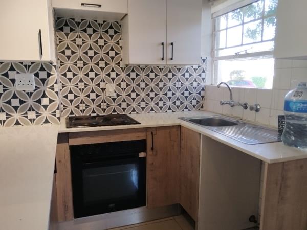 The apartment features a spacious open-plan living area leading out to a private patio and garden perfect for relaxing or entertaining. The kitchen offers ample cupboard space and space for one electrical appliance, while both bedrooms are generously sized with built-in cupboards. The bathroom includes a bathtub only.