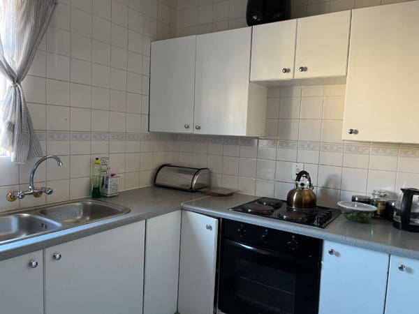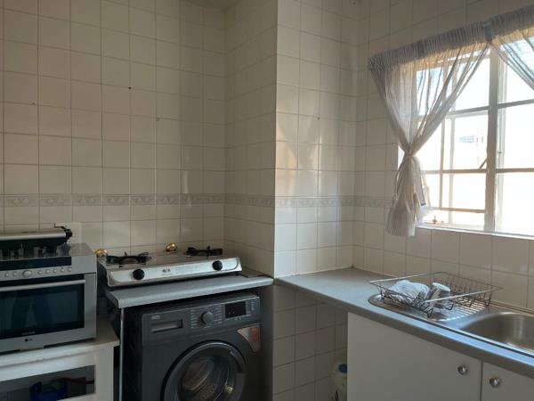 The kitchen is equipped with ample kitchen and counter space. It has space for two water appliances and a single door fridge.