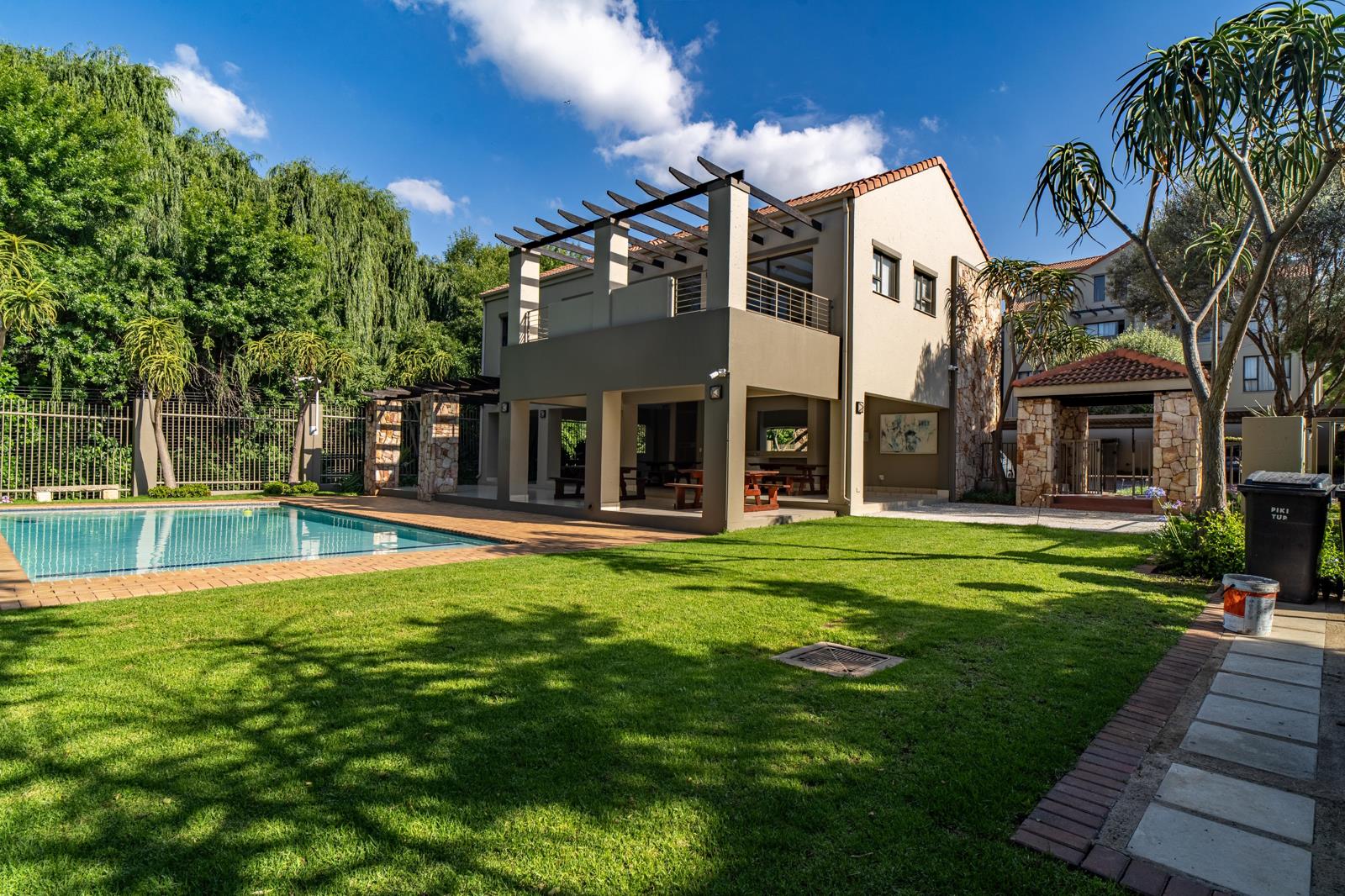 The estate offers a peaceful clubhouse surrounded by greenery, with a pool, braai facilities, guest toilets, and a tranquil outdoor setting filled with lots of birdlife.