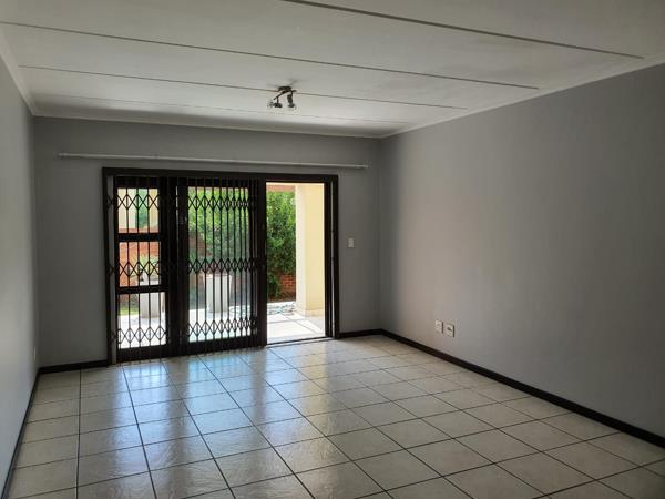 LOUNGE: Open plan spacious tiled with a sliding door leading out to the covered balcony with a built-in Braai.