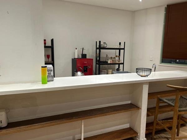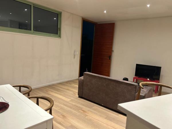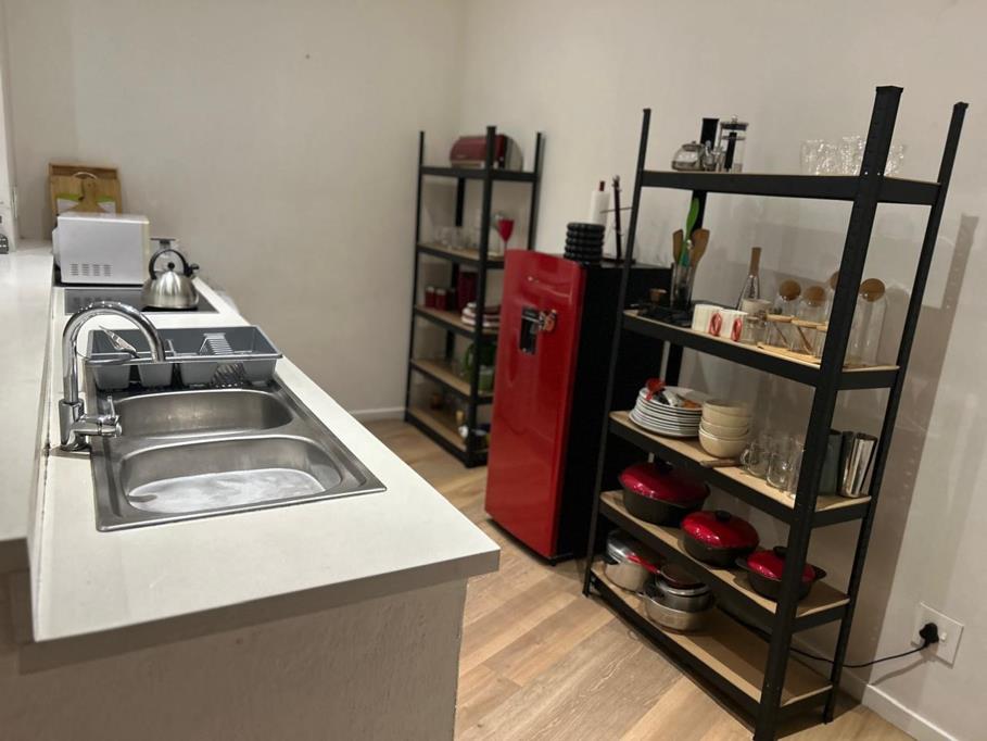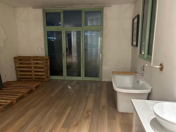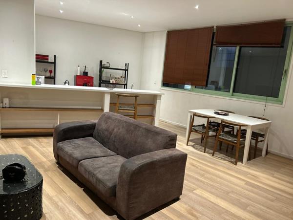 This Furnished contemporary one-bedroom residence offers a sophisticated urban living experience in the vibrant Maboneng precinct. The property features an intelligently designed open-plan layout, seamlessly integrating the living, dining, and kitchen areas, all adorned with modern light wood-look flooring. The primary kitchenette is equipped with a double stainless steel sink, sleek light-colored countertops, and essential integrated appliances including a stovetop, microwave, toaster, kettle, and a washing machine, ensuring utmost convenience. An additional bar or kitchenette area further enhances functionality, presenting open shelving, a distinctive red retro refrigerator, and a second double sink, contributing to both utility and aesthetic appeal.