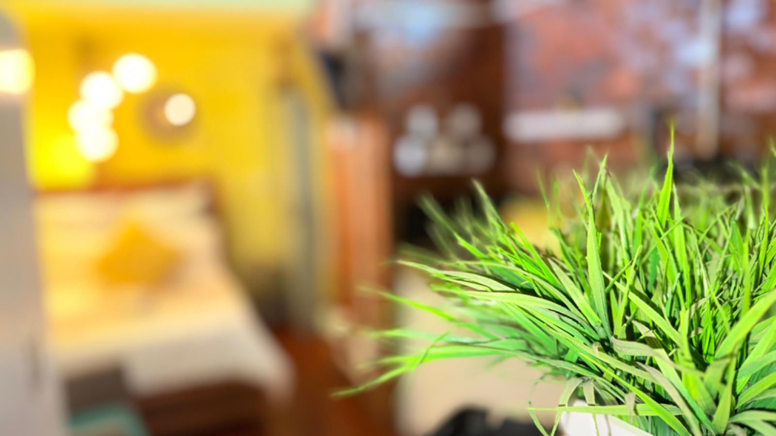 Inside, you''ll find a neat lounge area that flows seamlessly into your bedroom space, complete with a comfy bed and a handy white wardrobe for all your bits and bobs. There''s even a wall-mounted TV for those chill evenings. The kitchenette is efficiently equipped with the basics you need, like a microwave, kettle, and a cute red fridge, all set against a cool exposed brick wall that gives the place a real industrial-chic vibe. The bright yellow and lime green walls add a fun, energetic touch, making it a truly unique space.