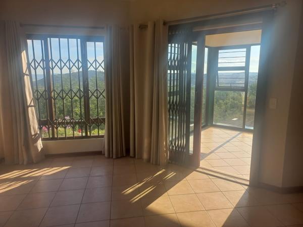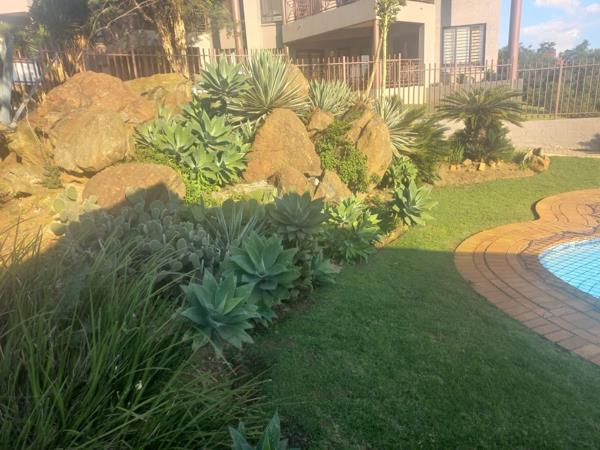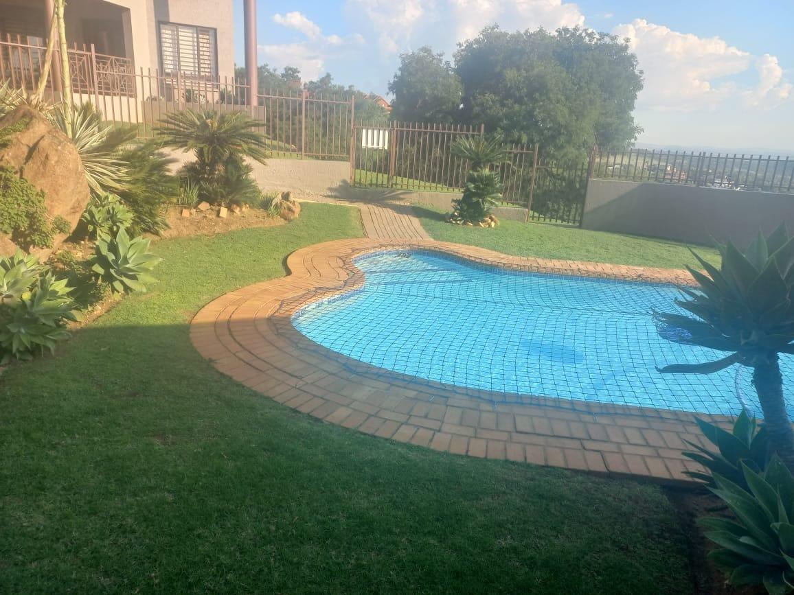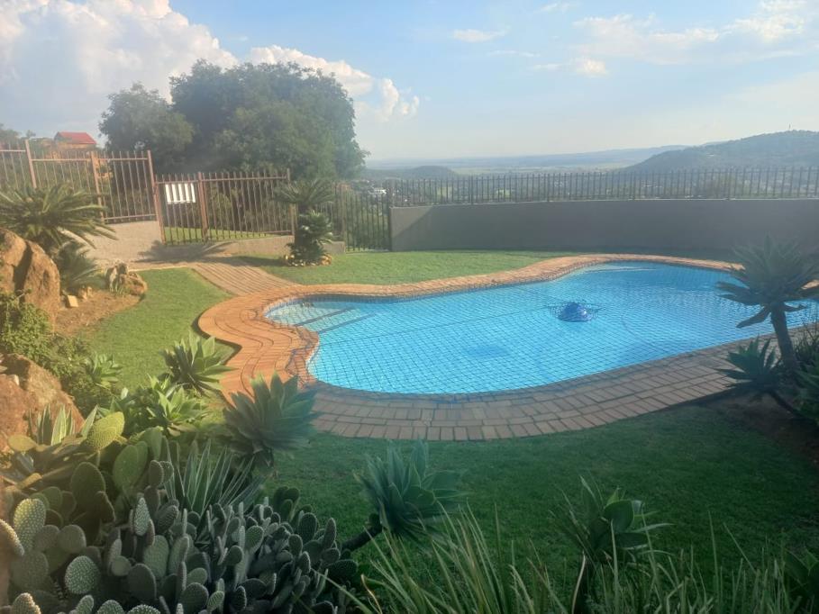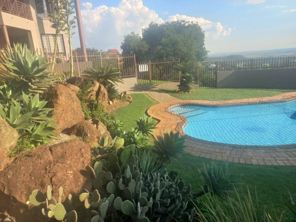 Step outside to discover a beautifully landscaped garden, complete with a sparkling swimming pool, perfect for enjoying the South African climate. The outdoor area boasts lush greenery, natural rock features, and paved pathways, all set against a backdrop of breathtaking panoramic scenic views. A private balcony extends the living space outdoors, offering an ideal spot for morning coffee or evening sundowners.