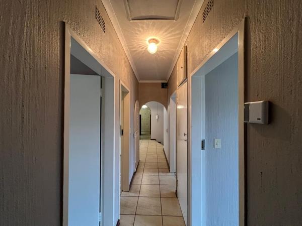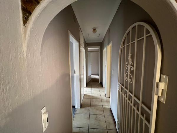Externally, the property is situated on an expansive 2635 square metre erf, offering considerable outdoor space. Residents will appreciate the private garden, a refreshing swimming pool and a patio area ideal for outdoor leisure. The property accommodates multiple vehicles with an integrated double garage and additional parking for three vehicles, complemented by a covered carport. This residence is pet-friendly, catering to households with animal companions. Security provisions include an access gate, with visible security bars and gates on windows and doorways, contributing to a secure living environment. While the property offers a solid foundation, it presents an opportunity for tenants to personalise and enhance the aesthetic to their preference, particularly in the garden areas which feature mature trees and natural privacy.