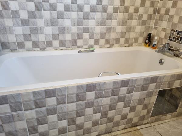 Both bedrooms are designed for comfort, featuring tiled floors and textured walls. One bedroom boasts a striking blue tufted headboard and a large window, allowing for plenty of natural light. The second bedroom offers the added convenience of a built-in wardrobe with a central mirror, providing generous storage, and direct access to the bathroom. The single bathroom is functional, complete with a bathtub and tiled walls, ensuring a practical space for daily routines.