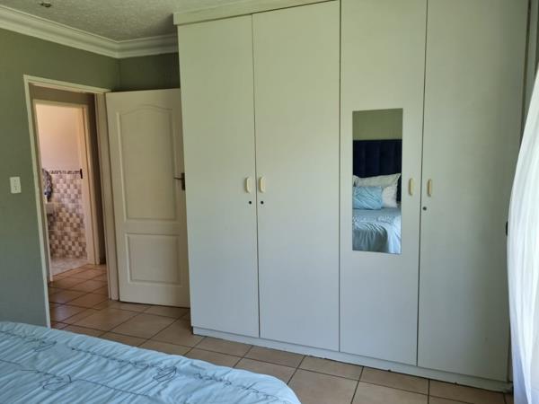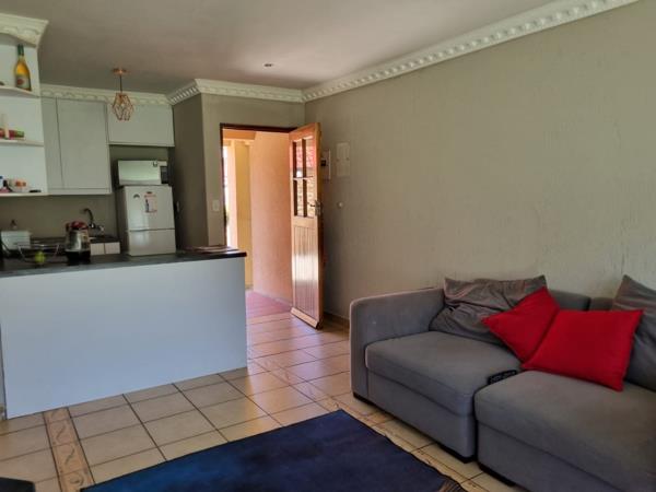 Externally, the property presents a neat appearance with a well-maintained, vibrant green lawn and a modern red tiled roof. Residents can enjoy a private patio area and access to a garden, perfect for relaxation. The complex offers practical amenities including paving, a driveway, and a communal braai area, fostering a sense of community. With two dedicated parking spaces, convenience is prioritized for residents.