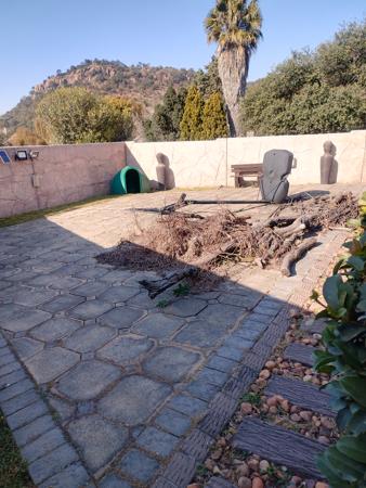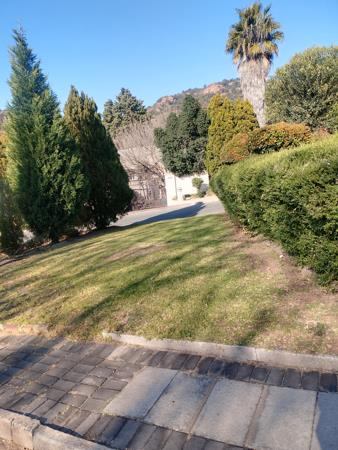 The home includes a drive-through double garage, accommodating 2 cars under cover, with additional parking available for up to 5 more vehicles. Enjoy outdoor living with a swimming pool, a lapa, and 4 balconies on the upper level, all offering breathtaking views of the mountains. The expansive yard spans 1239 square meters and is secured by an electric fence for peace of mind.