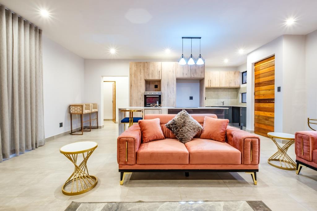 Spacious andamp Stylish Open-plan lounge, dining, and kitchen area with additional cupboard space for extra convenience.