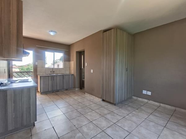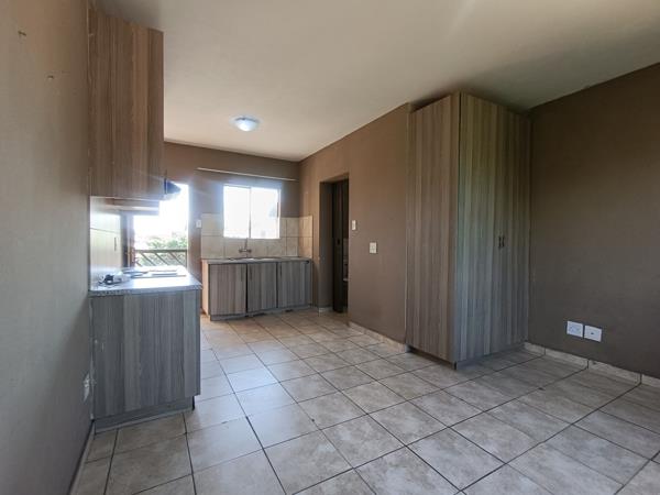 Step into a bright and airy open-plan living area that flows effortlessly into a functional kitchen. The unit includes built-in cupboards and a separate bathroom.