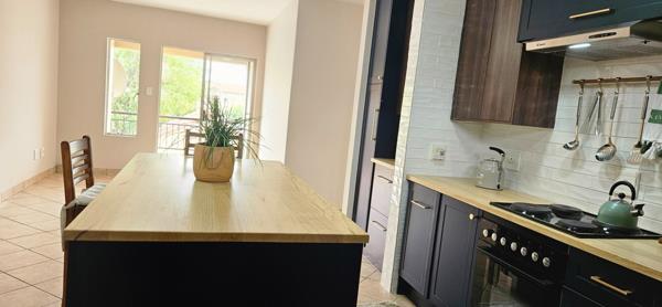 This spacious 2-bedroom, 2-bathroom unit offers modern comfort and style. One bathroom features a shower, while the other includes a bath and shower combination. Both bedrooms are generously sized with built-in cupboards. The brand-new kitchen is a standout feature equipped with a stove, coffee station, large island with ample working space, room for two appliances, and plenty of cupboard space. The open-plan lounge leads onto a balcony with a built-in braai, ideal for entertaining.