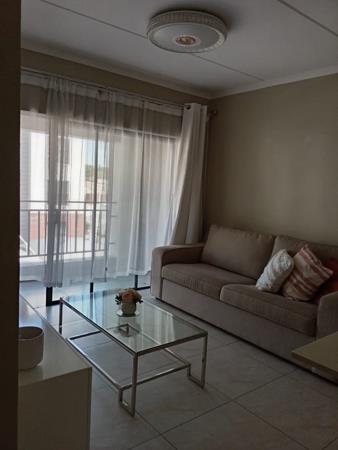 The open-plan kitchen flows seamlessly into the living area and out onto a private balcony, creating a relaxed indoor-outdoor feel. The bedroom is generously sized with built-in cupboards, and the bathroom is fitted with contemporary fixtures.