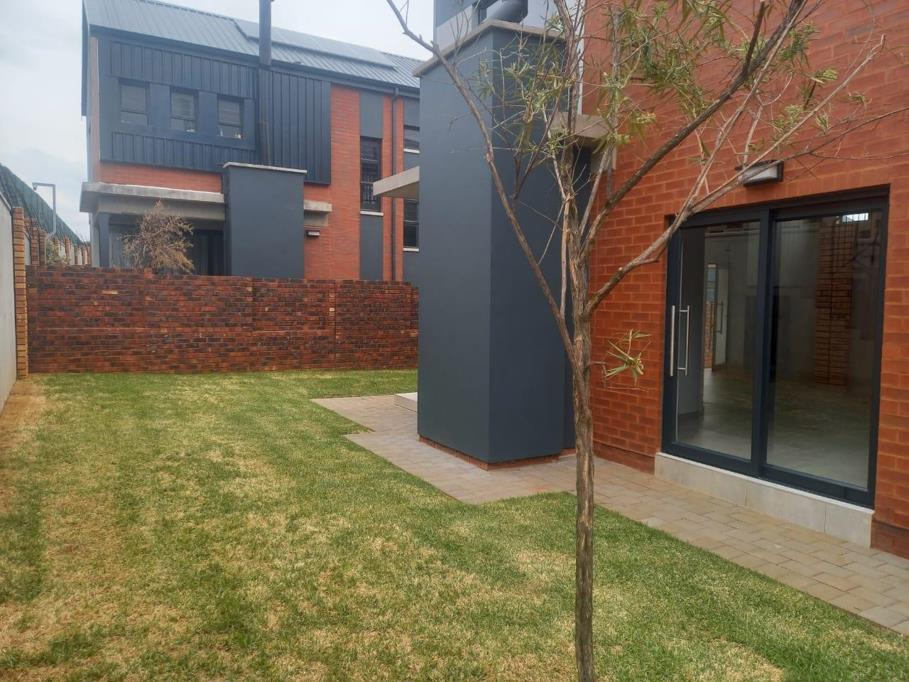 The back door leads to a small garden. Glass doors open from the living area to a covered patio with a built-in braai and a private garden, ideal for outdoor use. A guest toilet is located downstairs for convenience.