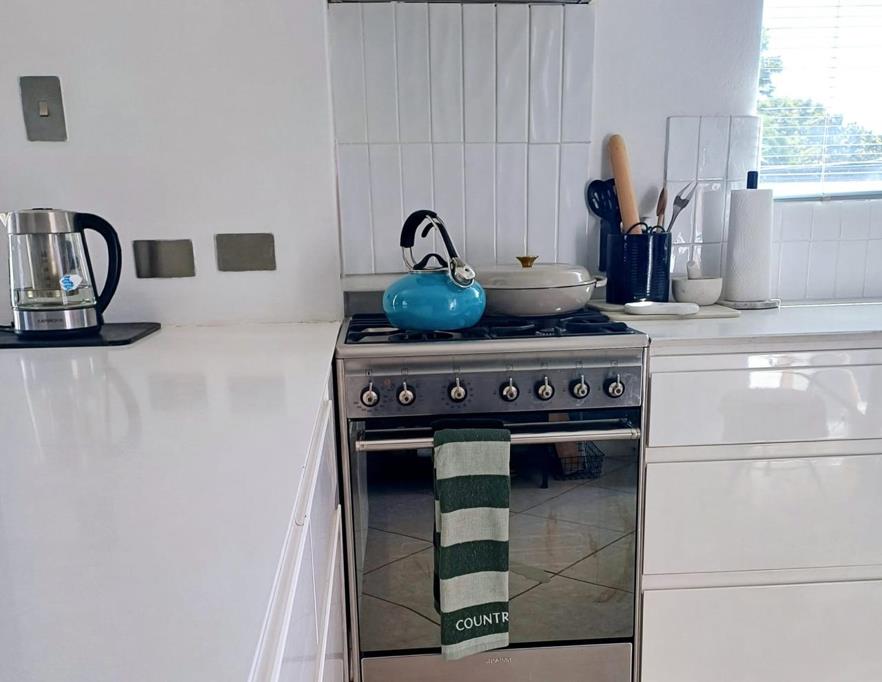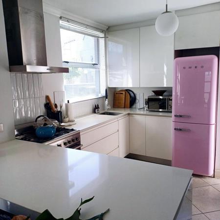 This contemporary 3-bedroom unit showcases an ultra-modern kitchen featuring a gas stove, elegant built-in cupboards, and space for a single-door fridge.