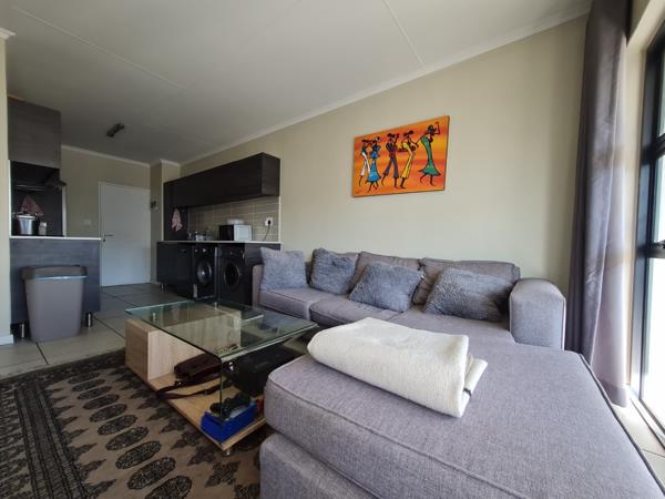 Fully furnished bigger apartment consisting of a bright and sunny bedroom with bed and desk and fitted blinds. Separate bathroom with shower. Good sized lounge with feature wall and covered balcony TV bracket, couch and patio furniture and curtains supplied. Open plan kitchen which is well fitted with 4 appliances, fridge, washing machine, tumble dryer and dishwasher. Covered parking. Comprising of lounge suite :Patio furniture, Crockery, cutlery ,bed and desk with chair