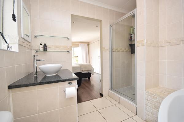 The kitchen is well-equipped with ample storage, contemporary earthy finishes, Rustenburg granite countertops, a gas hob with extractor, electric oven, and space for a double-door fridge plus two other appliances. A private courtyard off the kitchen provides extra ventilation and utility.