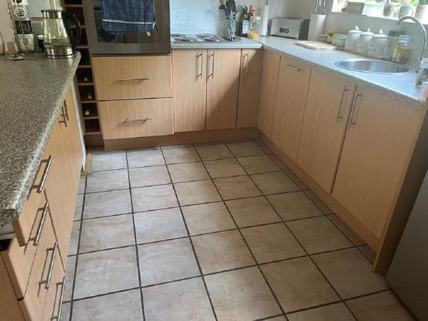 Modern kitchen with loads of cupboard space and scullery, has space for 2 appliances.