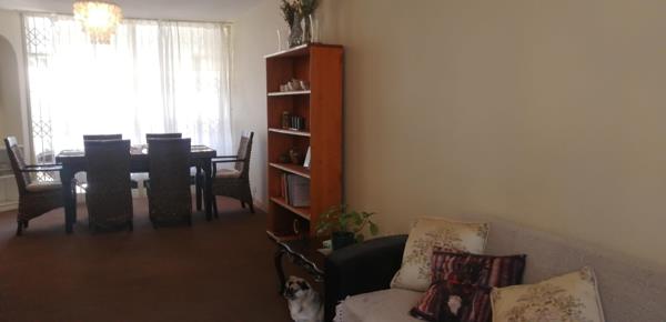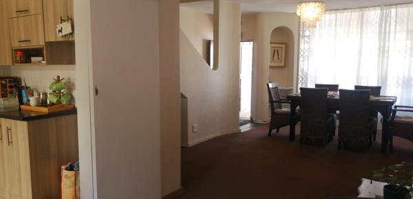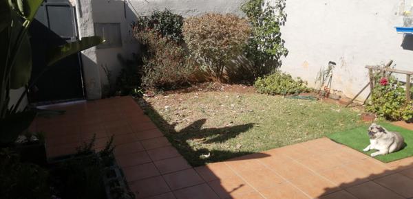 Open-plan lounge/dining room which is carpeted. This leads onto a patio and quaint small private garden. Hands-on kitchen, tiled floor, under counter oven, hob with extractor fan and ample cupboards. Space for single door fridge. Separate enclosed laundry.