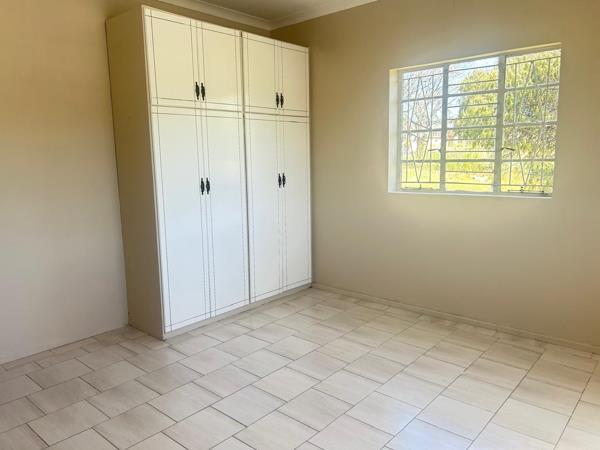 well-sized bedroom with built-in cupboards, and a bathroom with shower.