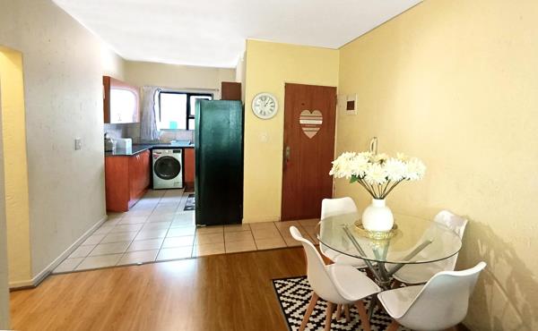 Front door opens into well-sized light-filled open-plan lounge and dining area leading onto the private balcony and small walled in garden plus a covered area where you can enjoy a braai.