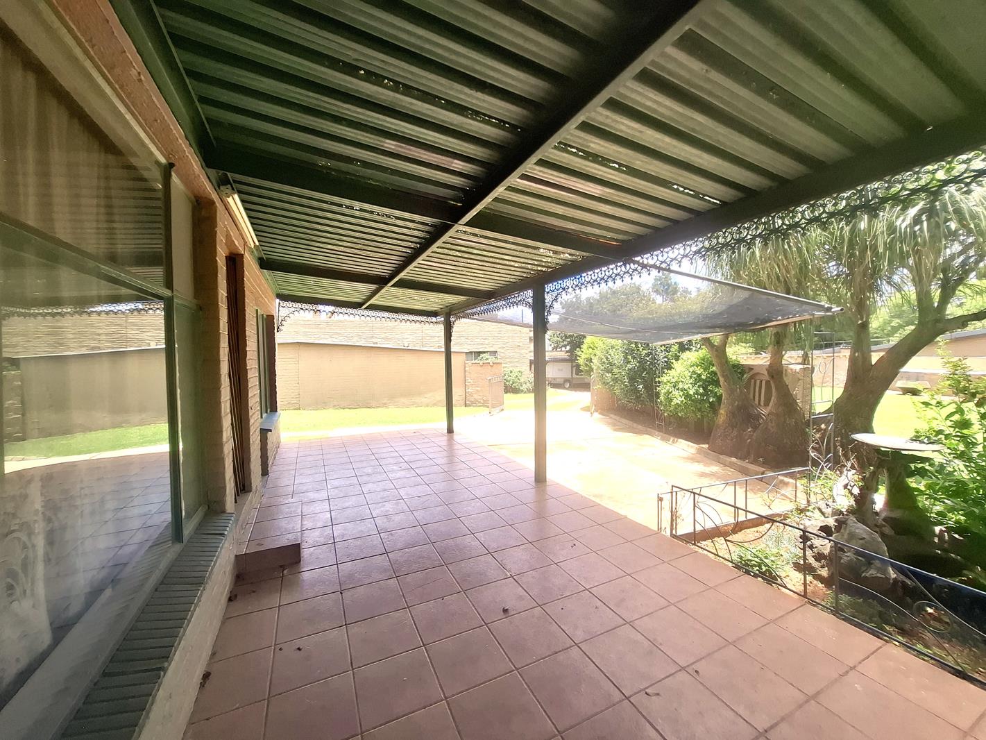 Large covered patio overlooking private garden that is great for medium size pets