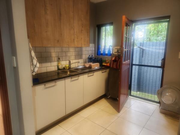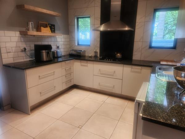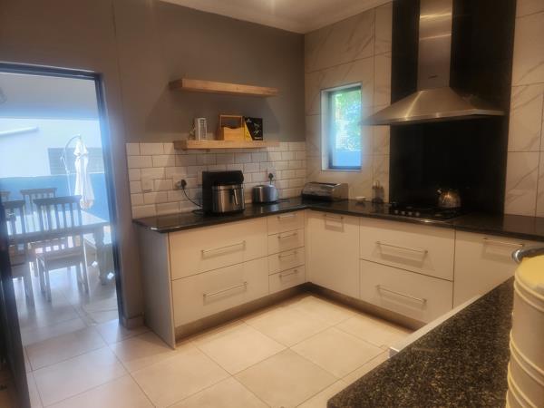 The kichen leads out to the covered patio with built in braai over looking the wooded deck and the neat easy to maintain garden.