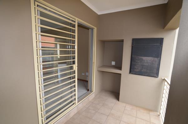This first floor unit is located in a secure complex in Florida Glen. The patio has a built in braai and has a counter for food preparation. As you enter through sliding door and security gate - you find yourself in an open plan reception area and open plan kitchen with granite tops. The kitchen has plumbed under counter appliance spaces for 2 appliances, with another under counter appliance space, a large pantry and plenty of storage space. Electric hob and undercounter oven finish off the kitchen.