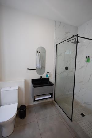 The apartment includes two generously sized bedrooms with freestanding cupboards and a contemporary bathroom complete with a shower, toilet, and basin.