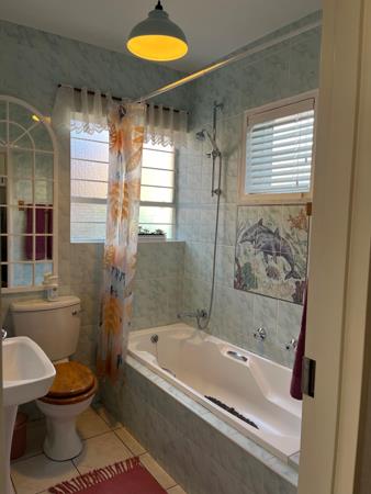 The bathroom sports a vintage charm with delightful dolphin tiles and a bath shower combo.