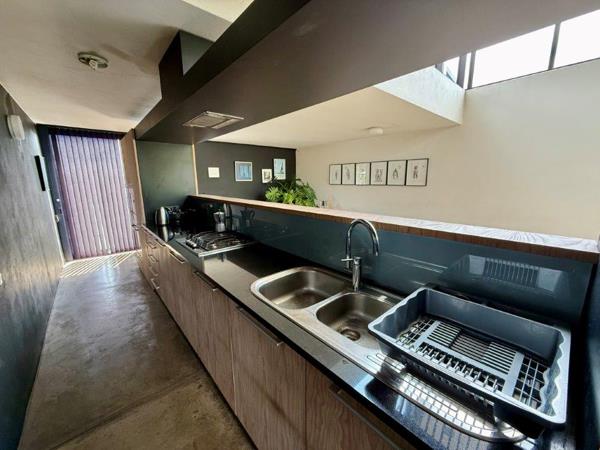 This apartment boasts 3 levels, comprising a fabulous main bedroom with en suite bathroom, ample cupboard space, all opening onto a patio overlooking beautiful trees and greenery. The 3rd level is double volume and consists of the fabulous contemporary kitchen which is ideal for entertaining with integrated appliances, gas cooker and is semi open plan through to the living areas . The lounge and dining rooms are spacious with built in wood cabinetry and double volume windows letting in loads of natural light. The final level comprises a fabulous roof terrace, perfect for entertaining, and sundowners. The complex has ample secure parking with one dedicated covered parking, a communal pool area , a 24hr security guard, plus additional guarded boom.