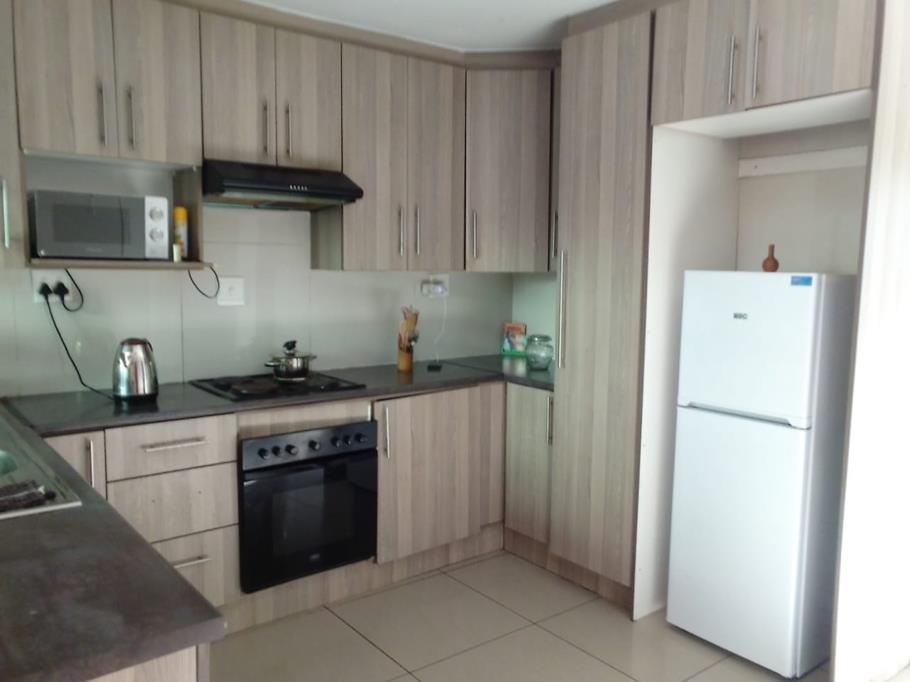 Neatly Finished Kitchen: Ample cupboard space, built-in stove, oven, and extractor fan.