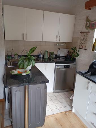 The well-appointed kitchen boasts high-quality flooring, built-in cupboards, space for two wet appliances, and a gas stove for efficient cooking.