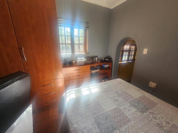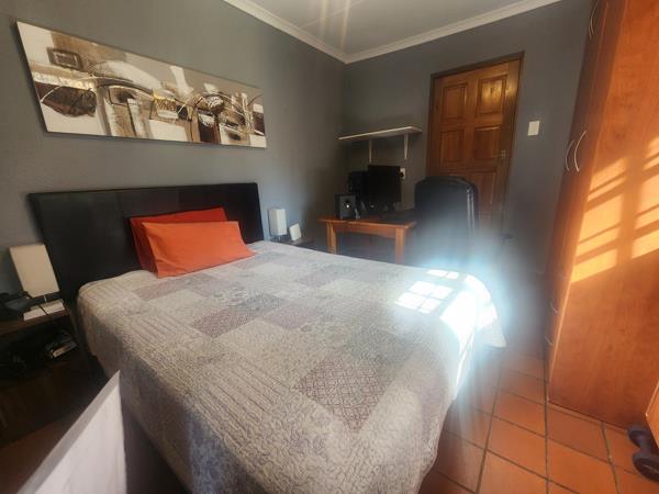 The bedroom has a queen size bed fitted wardrobes and a book case with drawers and there is space for a small table.