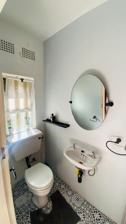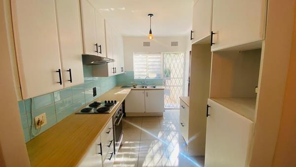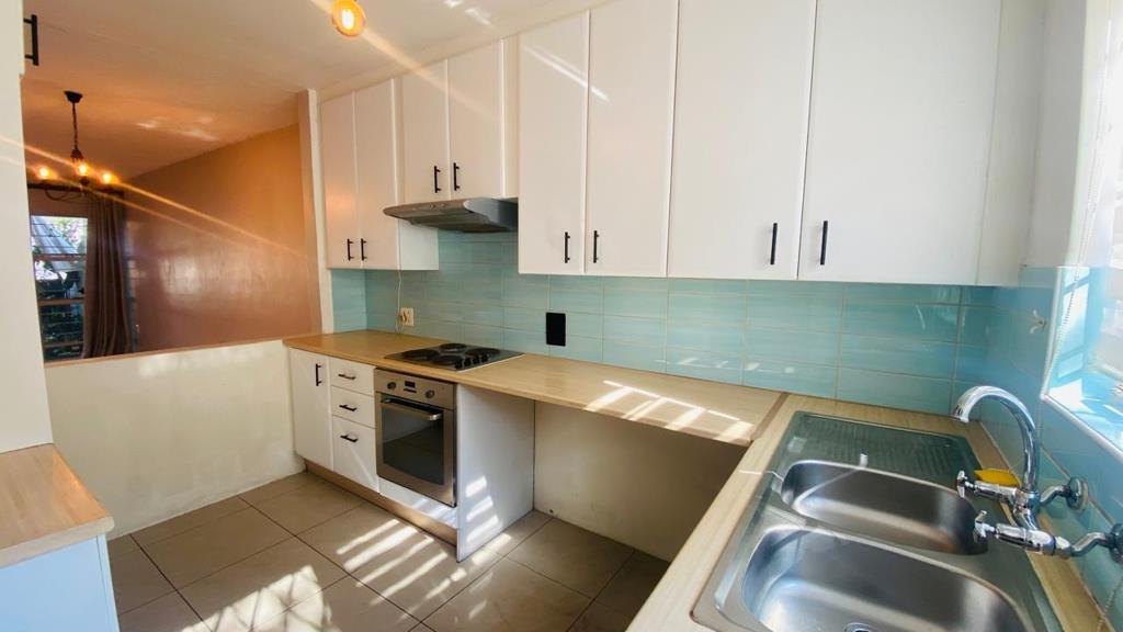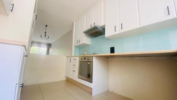 This inviting 2-bedroom, 1.5-bathroom apartment offers a comfortable and secure living experience within a well-maintained complex. The interior boasts a modern aesthetic, featuring an updated kitchen equipped with sleek white cabinetry, light wood-look countertops, and a vibrant light blue subway tile backsplash. Essential appliances include a built-in electric hob, oven, and extractor fan, complemented by a practical double sink. The open-plan lounge area, adorned with neutral walls and easy-to-maintain tiled flooring, provides a versatile space for relaxation and entertaining. Natural light floods the living areas, enhancing the bright and airy atmosphere. A convenient powder room with modern patterned floor tiles adds to the functionality of this home.