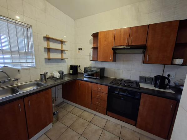 This apartment features a modern, spacious kitchen with ample cupboard space, and an open-plan lounge and dining area that leads onto a lovely patio with a built-in braai. The patio flows into a private garden, perfect for outdoor entertaining or relaxing after a long day.