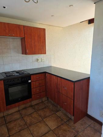 The cherry wood kitchen has black granite counter tops, an oven with hob, space for a single fridge, and washing machine. The double sink that is adjacent to the kitchen window over looks the main road and Northcliff mountains.