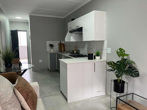 3rd floor, fully tiled, modern one-bedroom apartment. The apartment has a balcony with a built-in braai, a full ensuite bathroom with bath tub and shower, and an open-plan kitchen and living area. The unit is fully tiled throughout. The kitchen has a gas stovetop, washing machine connections and space for 1 water appliance. The living room is bright with natural light and is a good size.