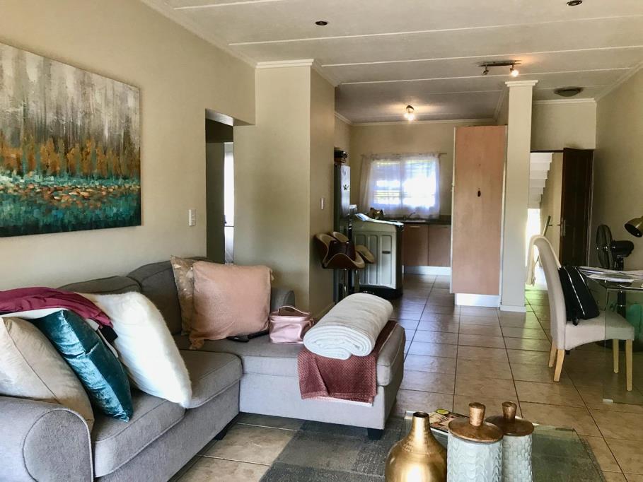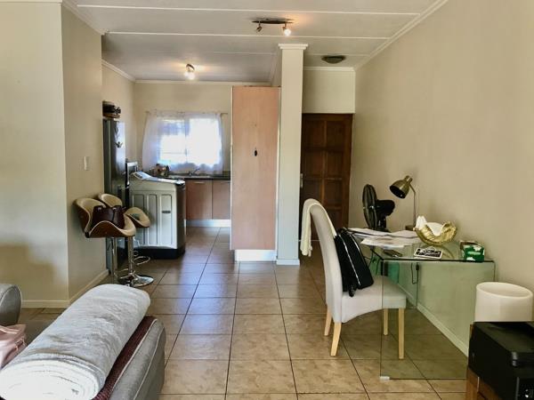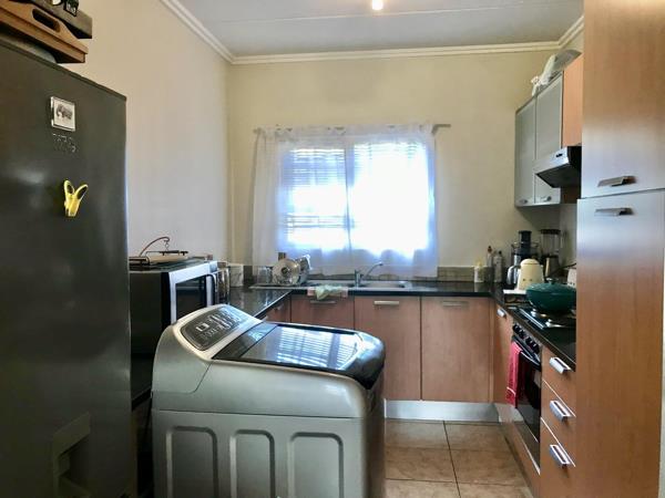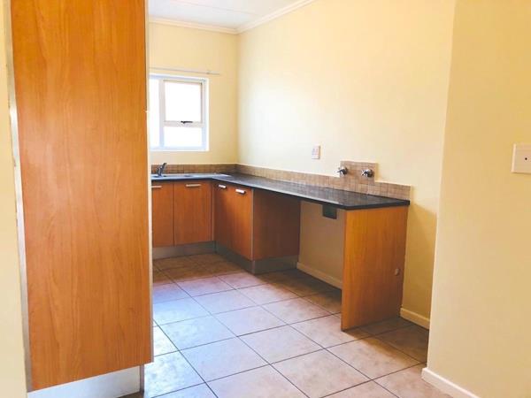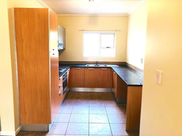 The unit features two well-sized bedrooms, both fitted with built-in cupboards, and two bathrooms, including a main en-suite. The spacious open-plan living area incorporates a modern kitchen with ample cupboard space, generous counter tops, and accommodation for three appliances a washing machine, dishwasher, and fridge. The kitchen flows seamlessly into the dining and lounge area, which opens onto a spacious covered patio, ideal for relaxed living and entertaining.